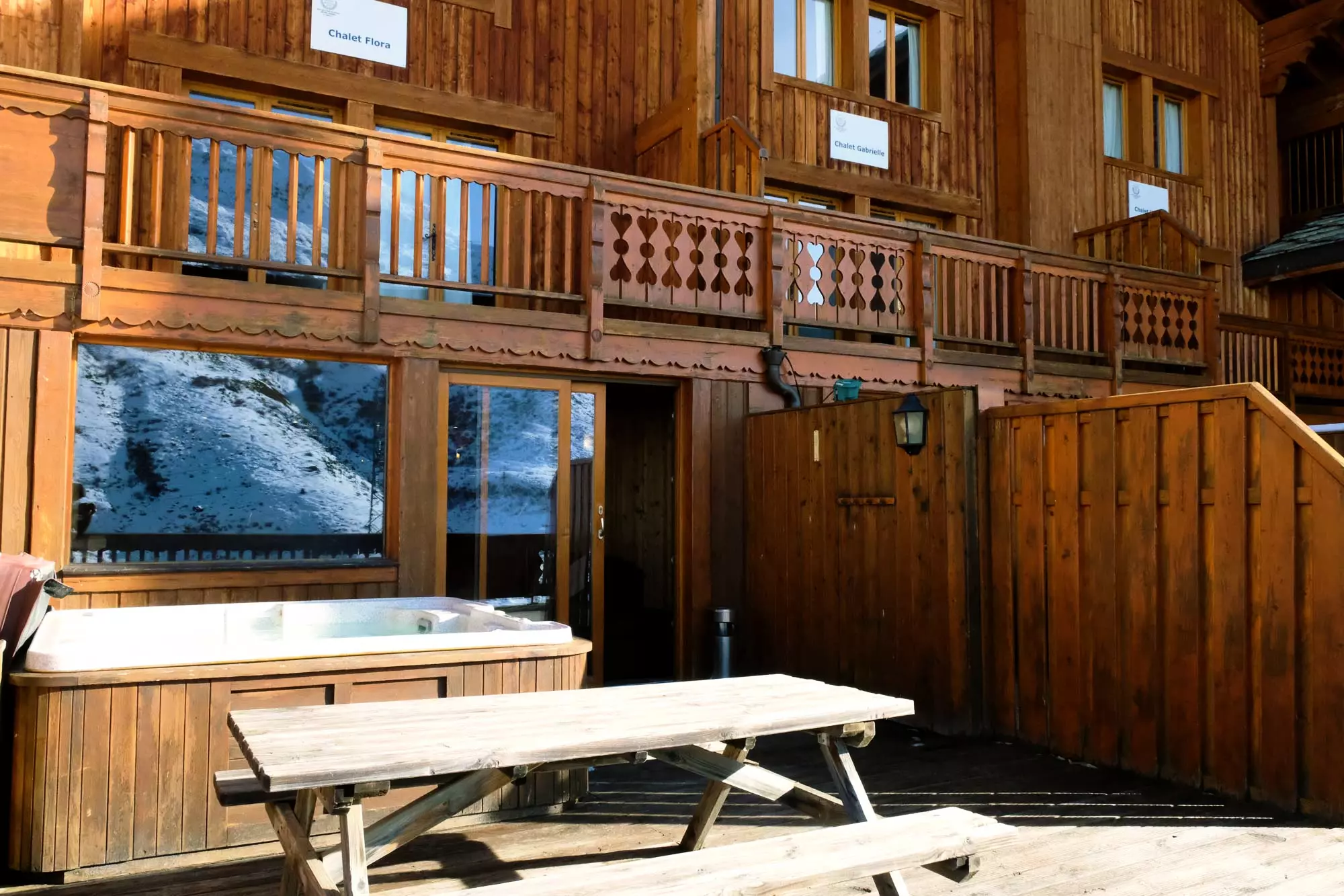 Après une journée sur les pistes de ski, profitez d'un verre sur la grande terrasse, et relaxez-vous dans le jacuzzi tout en profitant de la magnifique vue sur les montagnes qui se trouvent face à vous. La terrasse du logement est commune aux 5 chalets-appartements de l'immeuble mais des grands claustras en bois entre chaque logement permettent de couper le vis-à-vis avec la terrasse du logement d'à côté.