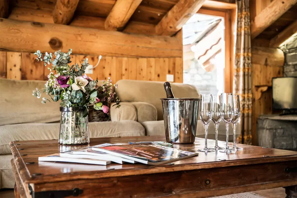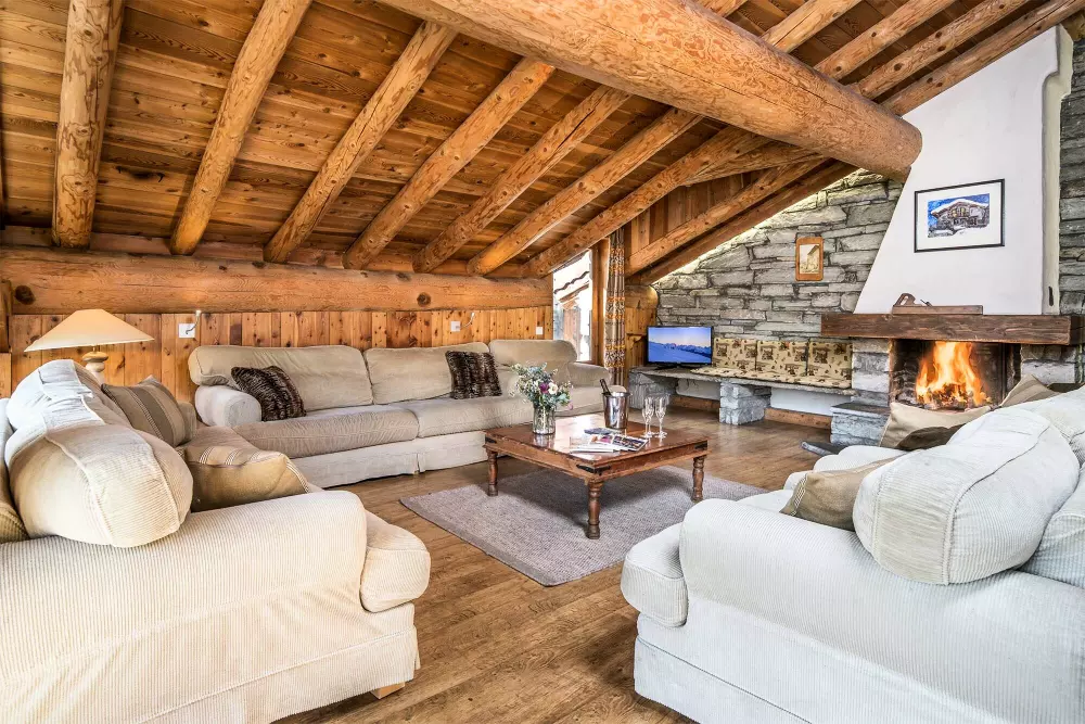 Les espaces de vie communs du chalet sont tous situés au deuxième étage, offrant une vue imprenable sur Val d'Isère depuis le salon et la salle à manger ouverte. La pièce est grande et spacieuse avec des boiseries savoyardes classiques et de grandes poutres apparentes. Un des murs est entièrement en verre avec une grande table à manger positionnée à l'endroit idéal pour profiter de la vue. En dînant le soir, le clair de lune illumine les montagnes tandis qu'au petit-déjeuner, le soleil passe au-dessus de la Solaise, tous deux offrants de superbes paysages du matin au soir.