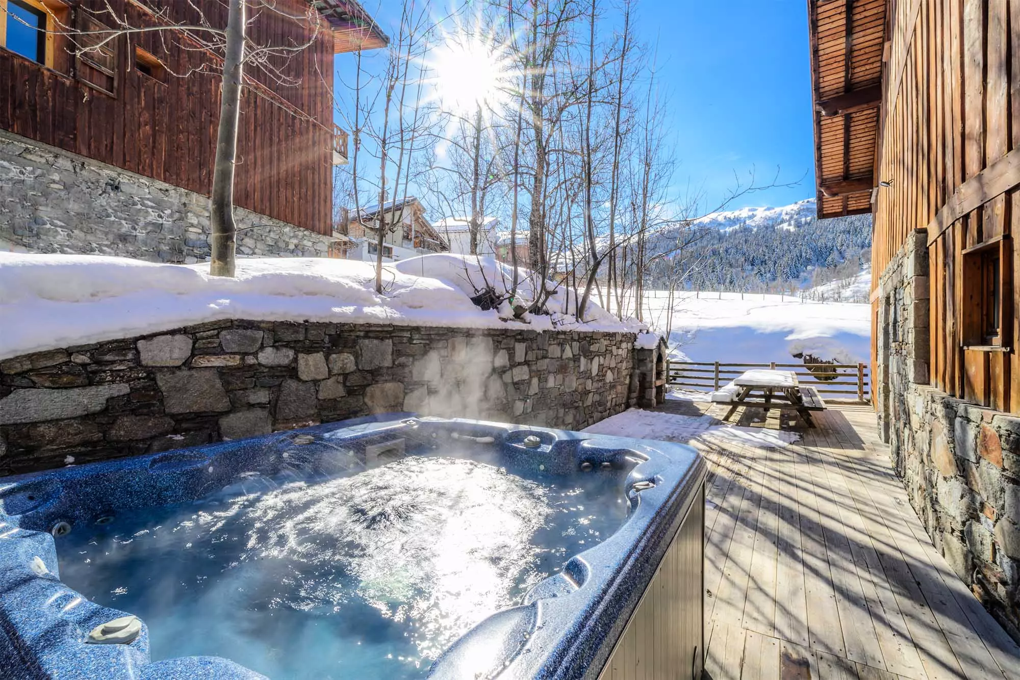 Accédez à la grande terrasse via le salon ou la salle à manger, où vous profiterez du jacuzzi extérieur, l'endroit idéal pour se détendre avec un verre après une journée avec une vue sur la vallée de Méribel.