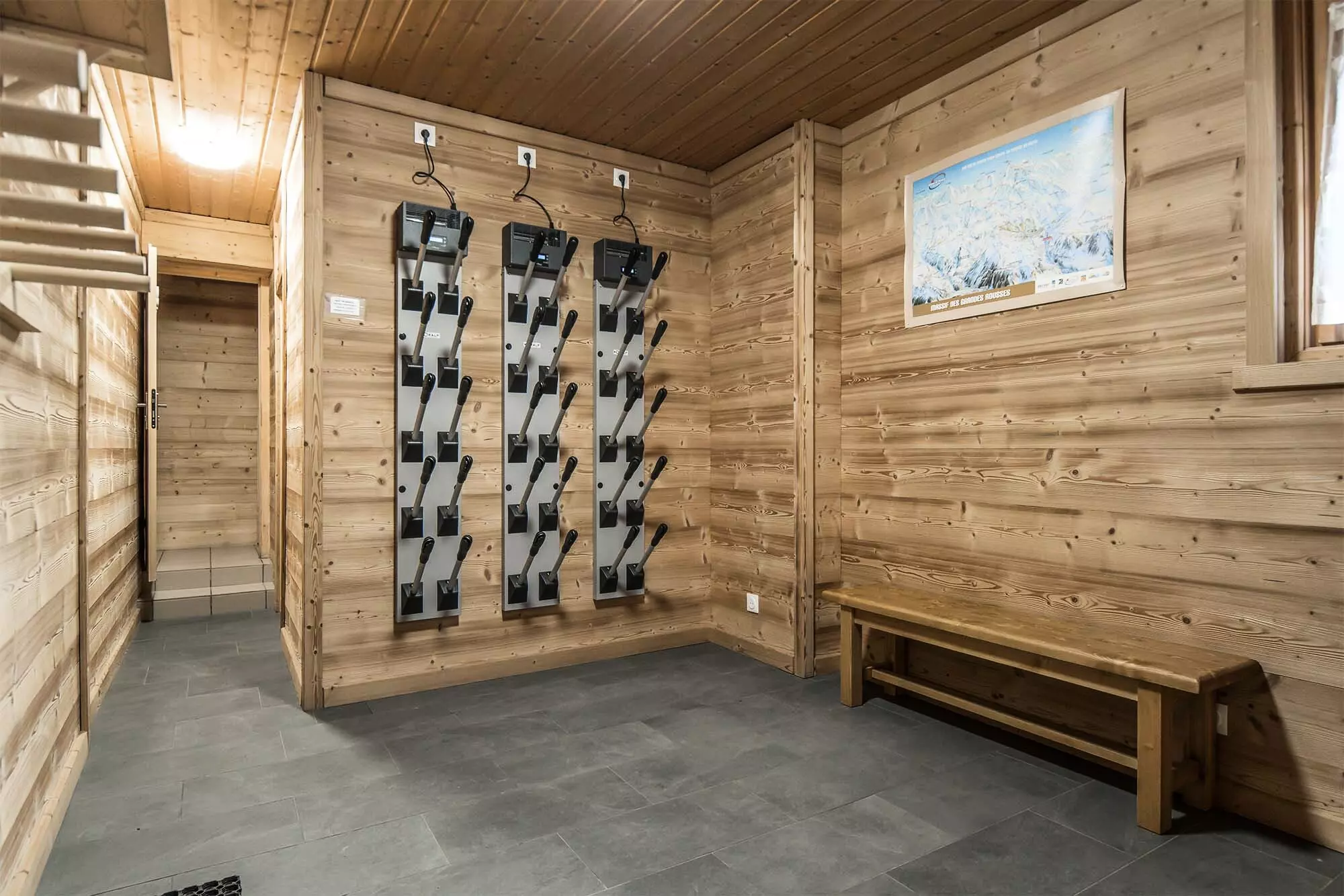 Au rez-de-chaussée inférieur, vous trouverez un local à ski équipé d'un chauffe-chaussures. Le matin, attrapez vos skis, enfilez vos chaussures déjà chaudes et élancez-vous sur les pistes de l'Alpe d'Huez.