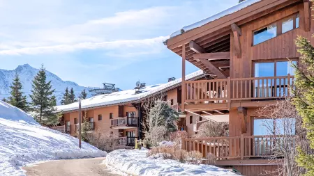 Vous poserez vos valises dans un appartement cocon où le bois, omniprésent, apporte une atmosphère chaleureuse. Conçus comme des chalets, les deux bâtiments de la résidence sont reliés par un petit sentier. Le bâtiment Chantel vous ouvre les portes de sa salle de fitness. Il est pourvu également d'un restaurant et un snack. Idéal pour les familles, le bâtiment Roselend dispose d'un accès direct à la piscine et se trouve à 10 min à pied de la station.