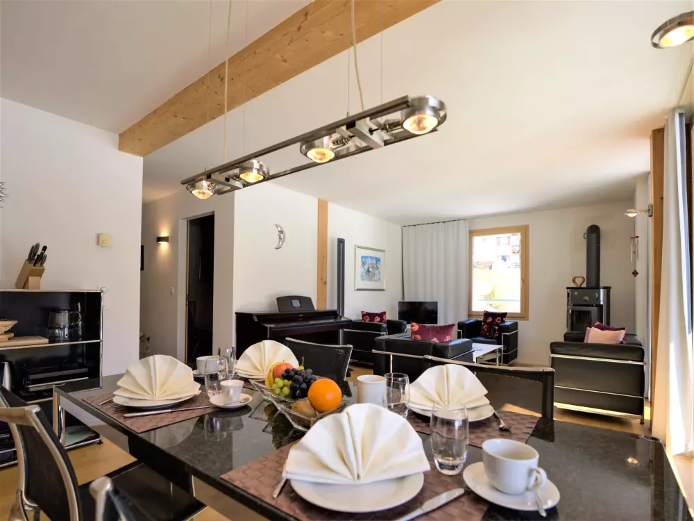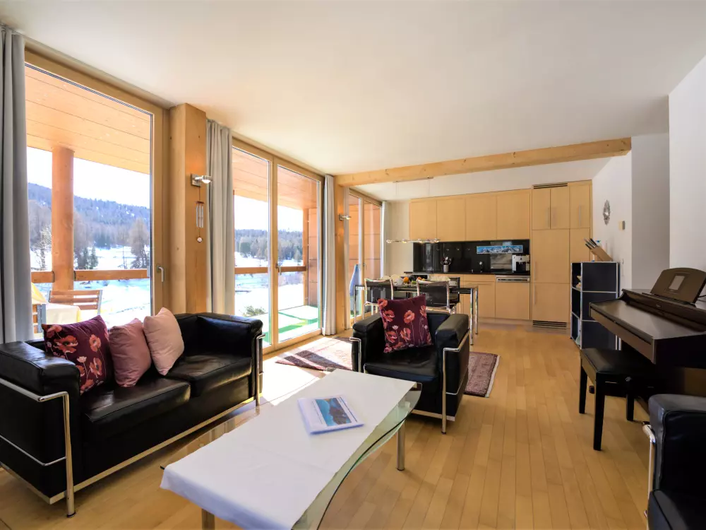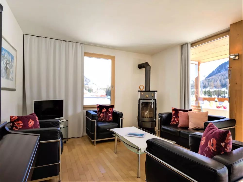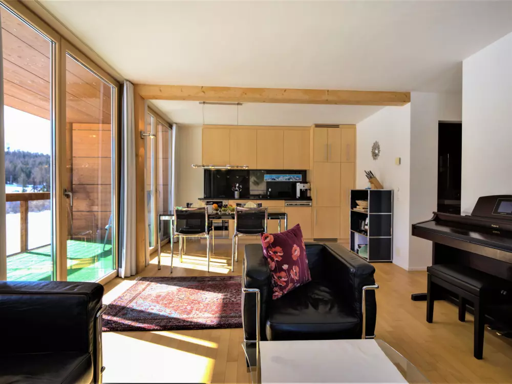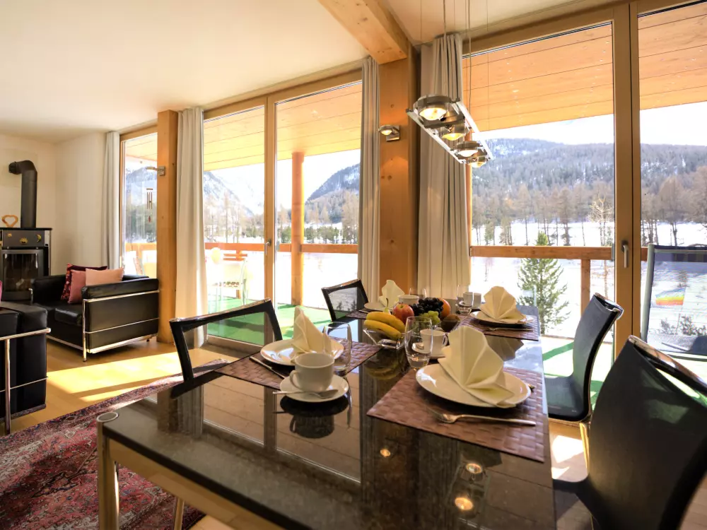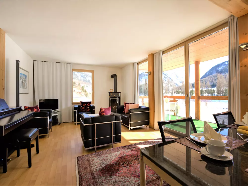 Chesa Lej à 7 km de St. Moritz: Maison en bois moderne "Chesa Lej", année de construction 2002. Dans le quartier de Muragls, situation tranquille, ensoleillée sur un versant, à 6 km du lac, à 20 m de la rivière. Infrastructures de la Maison: chauffage central, lave-linge, sèche-linge. Accès en voiture jusqu'à la maison. Place de parking No M2. Magasins 1 km, supermarché 1.8 km, restaurant 1 km, boulangerie 1 km, café 1.8 km, location de bicyclettes 2.1 km, arrêt de bus "Pontresina, Godin" 650 m, gare ferroviaire 2.5 km, piscine couverte 2.1 km, lac St. Moritzer See 6 km. Terrain de golf (18 trous) 4.3 km, ecole de surf 12 km, tennis 1.1 km, tennis couvert 7.4 km, golf miniature 7.2 km, centre équestre 2.7 km, chemins de randonnées pédestres depuis la maison 500 m, piste cyclable 1 km, téléphérique 4.4 km, téléski 2 km, location de ski 2.1 km. École de ski 1.8 km, école de ski d'enfants 1.8 km, piste de luge 1.3 km, ski de fond 500 m, patinoire 1.1 km, jeux pour enfants 1.1 km. Attractions à proximité: Museum Alpin 1.9 km, Kirche St. Maria 2.6 km, Alp-Schaukäserei Morteratsch (Sommer) 8 km, Segantini Museum in St. Moritz 7.3 km, Bernina Express UNESCO Welterbe. Les domaines skiables de renommée sont facilement accessibles: Corviglia Piz Nair 4.4 km, Diavolezza - Lagalb 14 km, Corvatsch - Furtschellas 13 km. Les lacs connus sont facilement accessibles: St. Moritzer See 6 km, Silvaplaner See 11.6 km, Silser See 15.5 km. Région de randonnées: Stazerwald & Stazersee, Muottas Muragl, Val Roseg & Val Morteratsch. Veuillez noter: sans ascenseur. Déchargement et chargement des bagages à la location de vacances.